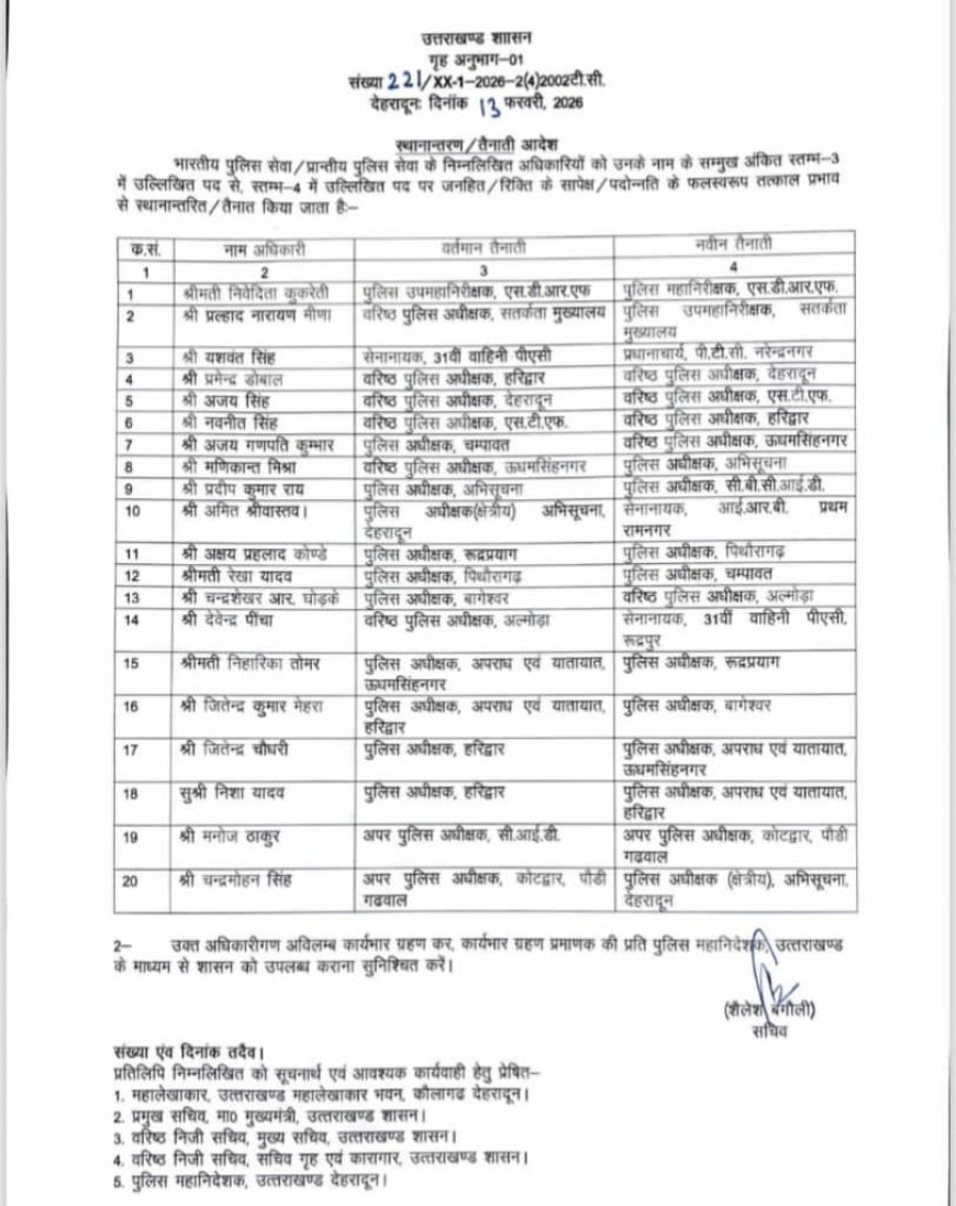 इसके अलावा उधम सिंह नगर, चंपावत, पिथौरागढ़, रुद्रप्रयाग, बागेश्वर और अल्मोड़ा समेत कई जिलों में पुलिस अधिकारियों के कार्यक्षेत्र बदले गए हैं। शासन का कहना है कि कानून व्यवस्था को और मजबूत बनाने के उद्देश्य से यह फेरबदल किया गया है।