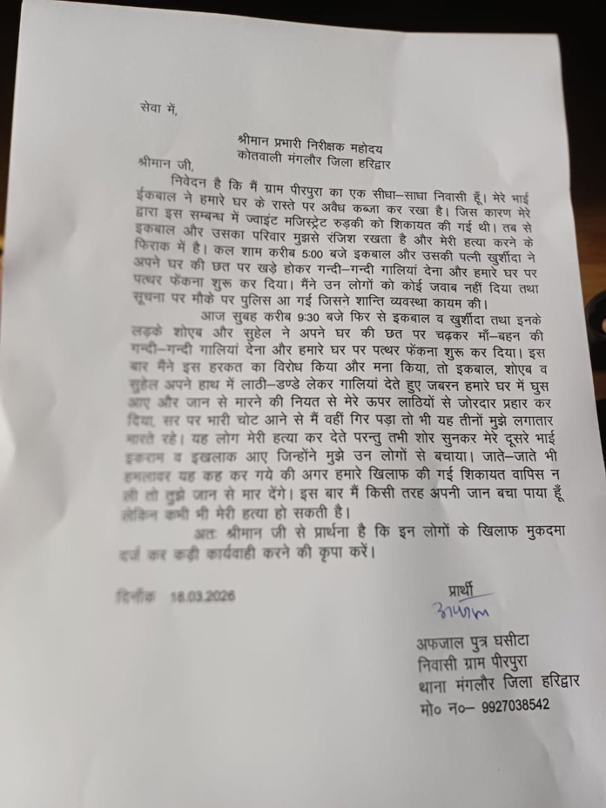 घटना के बाद घायल अफजाल ने मंगलौर कोतवाली पहुंचकर आरोपियों के खिलाफ नामजद तहरीर दी है। उसने पुलिस से अपनी और अपने परिवार की सुरक्षा सुनिश्चित करने के साथ-साथ आरोपियों के खिलाफ सख्त कानूनी कार्रवाई की मांग की है।